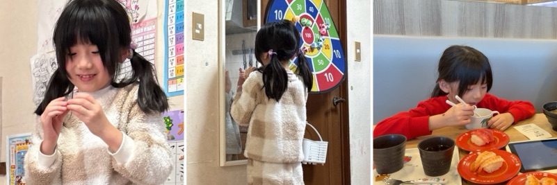 お昼過ぎ、家族で回転寿司へ行きました。あいかも弟も回転寿司の醤油ラーメンが大好きで、家で持って行ったリング付きの箸で頑張って美味しく食べました。ラーメンを食べている途中、あいかが「ラーメン食べ終わったら家に帰りましょう」と言っていました。来たばかりだったので、「ポテトも食べる?」と写真を見せながら聞いてみましたが、「食べない」と言ってラーメンだけ食べました。