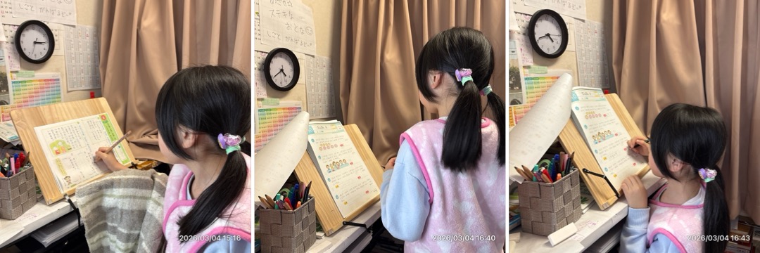 ところで、4時30分に近づくほど、あいかが椅子から立って問題を解いたり、ぴょんぴょんしたり、落ち着かない様子が見えました。退勤時間間近の人が早く帰りたいのに、業務が終わらなくて困っている様子でした。その様子を見てママがくすくす笑っていたら、あいかが「ママ、どんな顔?うふふふふ〜これ、誰が言った言葉?」と言いました。「ママの笑い声」と返事してあげたら、もう一回ぴょんぴょんして、ママの笑い声を真似したり、笑ったりしながら問題を解いていました。プリントは、間違えている問題もちょこちょこありましたが、4時50分に終えることができました。